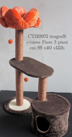 CTCAP1Tiragraffi con doppio palo tre piani e cuccia cm70x125 1pz | CT9111Tiragraffi albero con doppia cuccia e giochi cm54x54x140 1pz | CT110972Tiragraffi Fiore cm85x40x122 1pz |